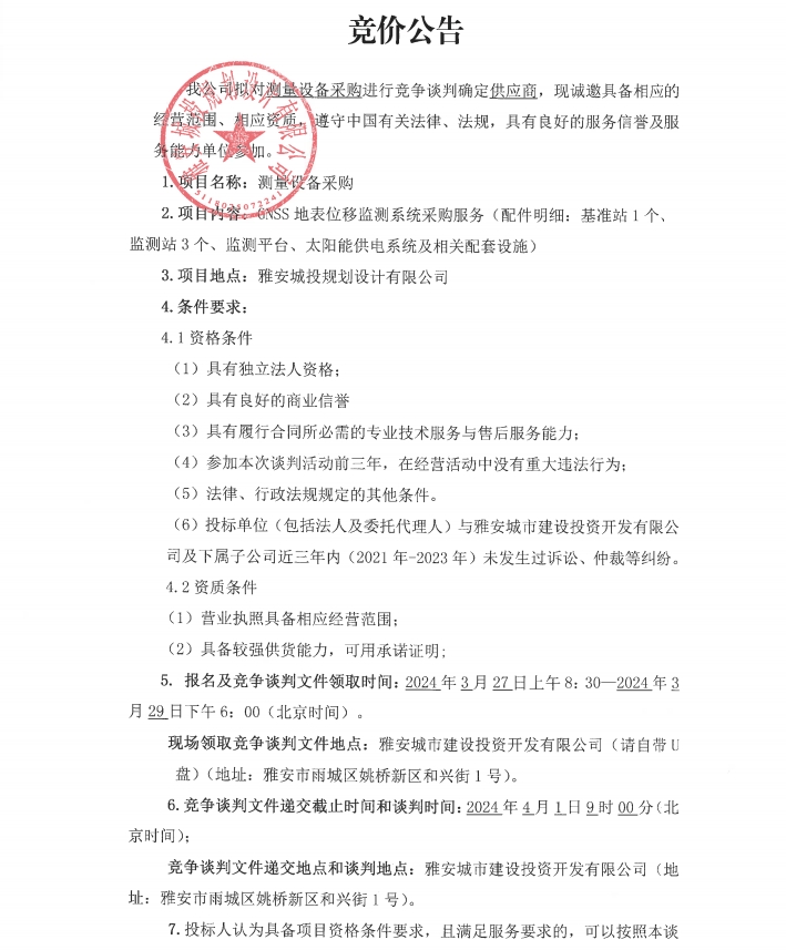 測(cè)量設(shè)備GNSS地表位移監(jiān)測(cè)系統(tǒng)采購競價(jià)公告