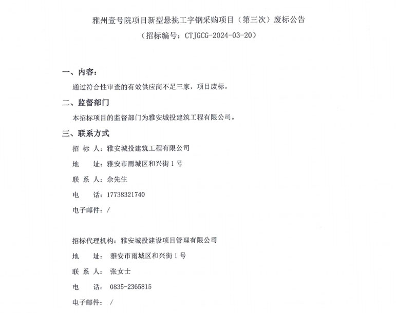 雅州壹號(hào)院項(xiàng)目新型懸挑工字鋼采購(gòu)項(xiàng)目(第三次)廢標(biāo)公告