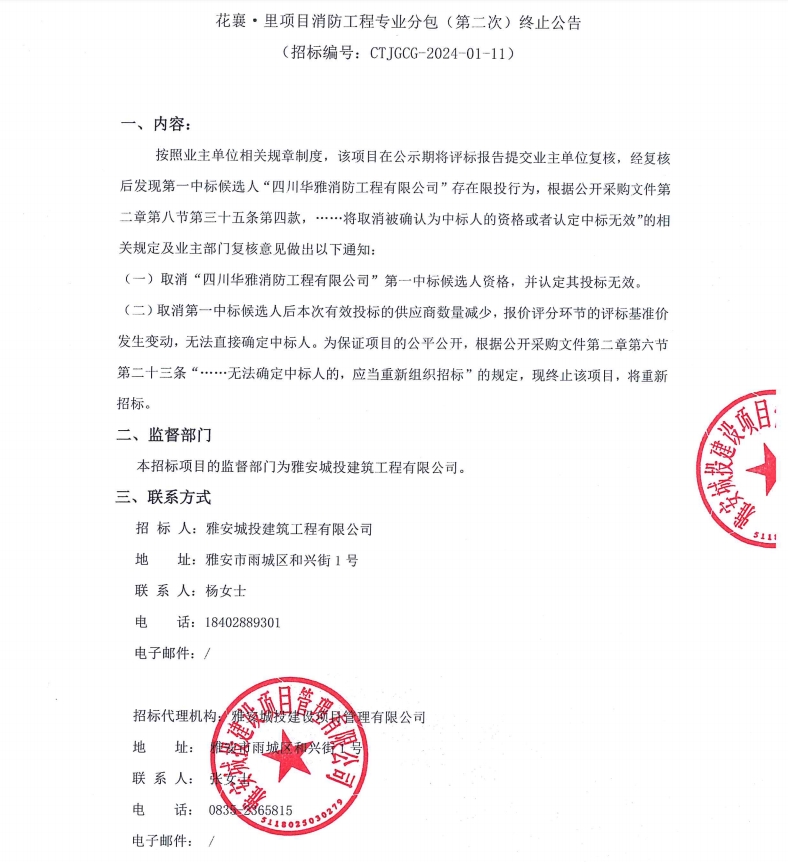 花襄·里項(xiàng)目消防工程專業(yè)分包(第二次)終止公告
