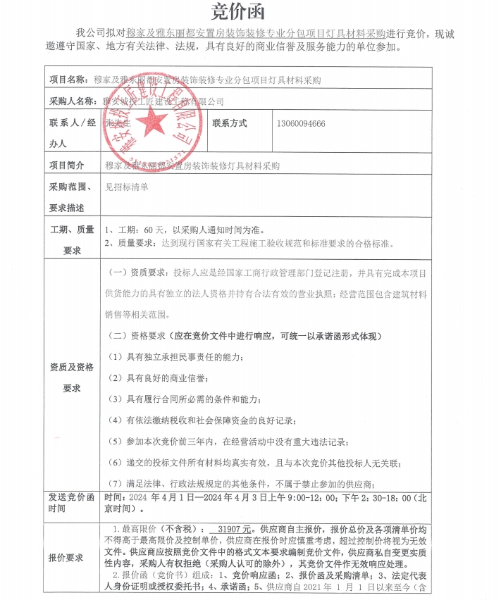 穆家及雅東麗都安置房裝飾裝修專業(yè)分包項(xiàng)目燈具材料采購競價公告