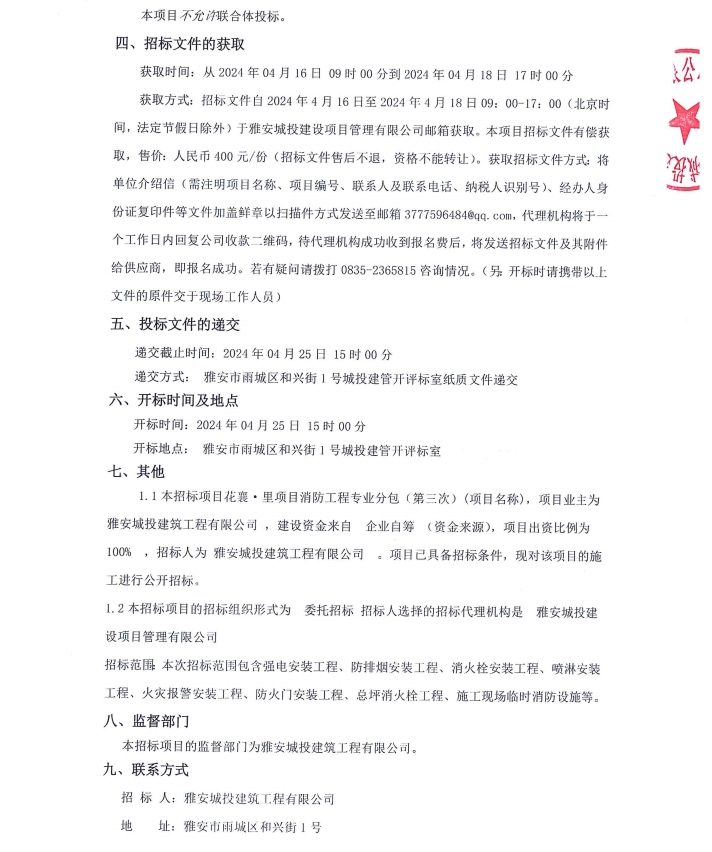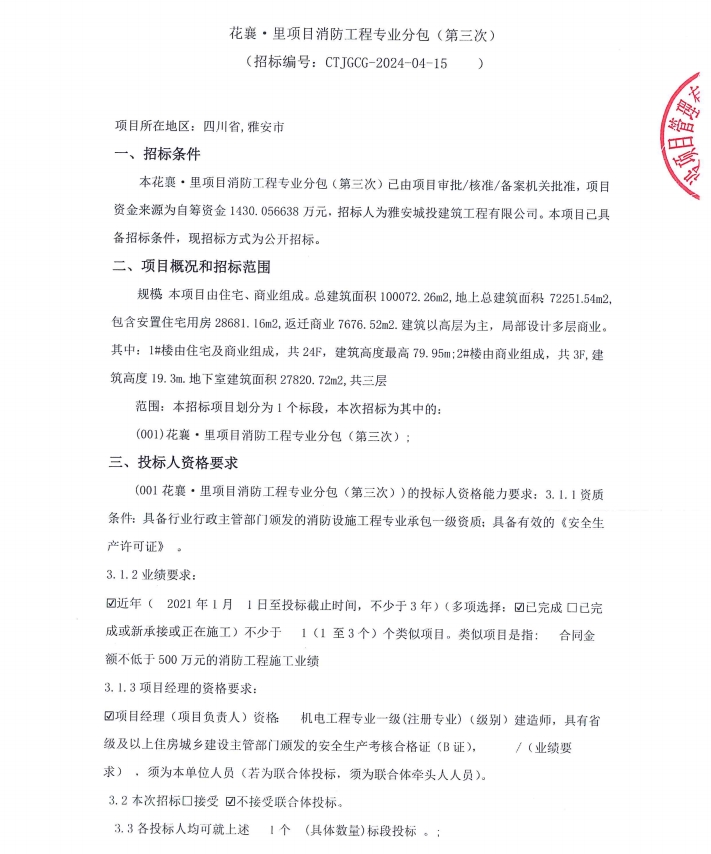 花襄·里項(xiàng)目消防工程專(zhuān)業(yè)分包(第三次)公告