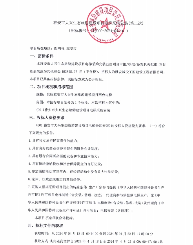 雅安市大興生態(tài)旅游建設(shè)項目電梯采購安裝(第二次)公告