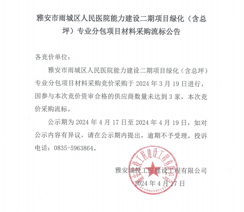 雅安市雨城區(qū)人民醫(yī)院能力建設(shè)二期項(xiàng)目綠化(含總坪)專業(yè)分包項(xiàng)目材料采購(gòu)流標(biāo)公告