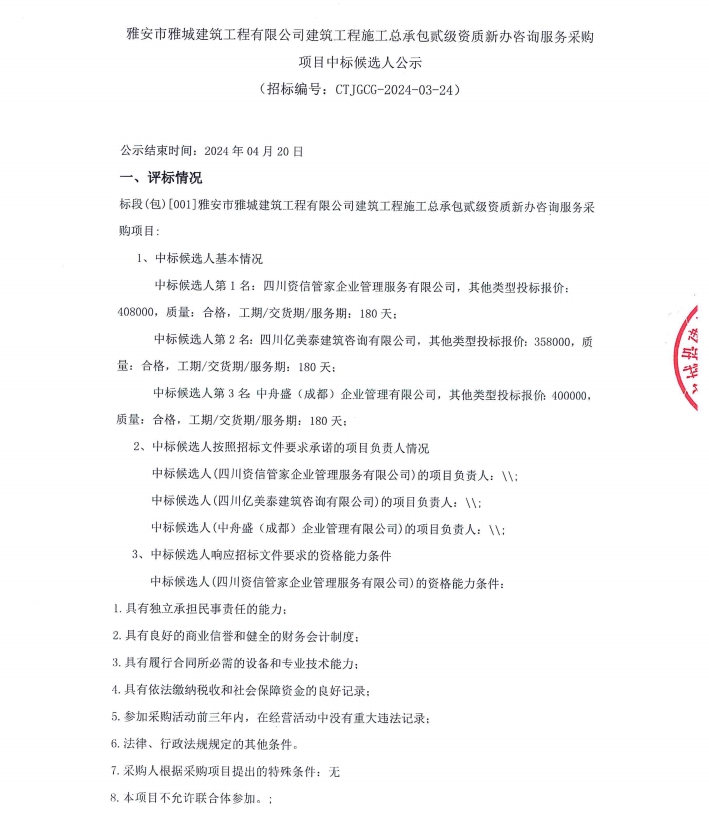 雅安市雅城建筑工程有限公司建筑工程施工總承包貳級(jí)資質(zhì)新辦咨詢(xún)服務(wù)采購(gòu)項(xiàng)目中標(biāo)候選人公示