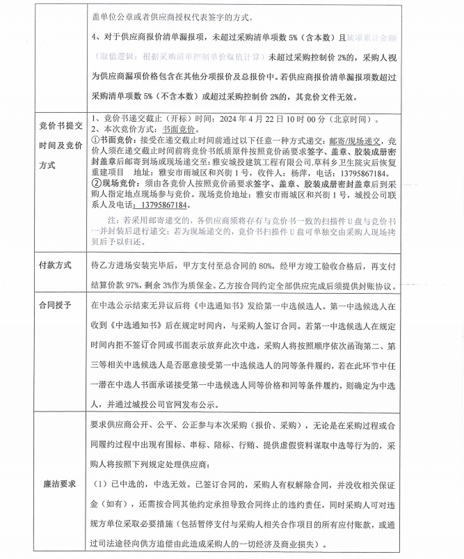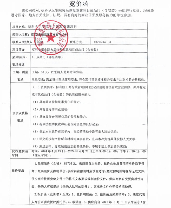 草科鄉(xiāng)衛(wèi)生院災后恢復重建項目成品門(含安裝)采購競價公告