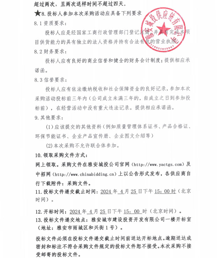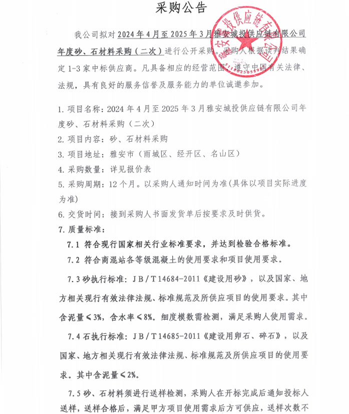 2024年4月至2025年3月雅安城投供應(yīng)鏈有限公司年度砂、石材料采購(gòu)(第二次)公告