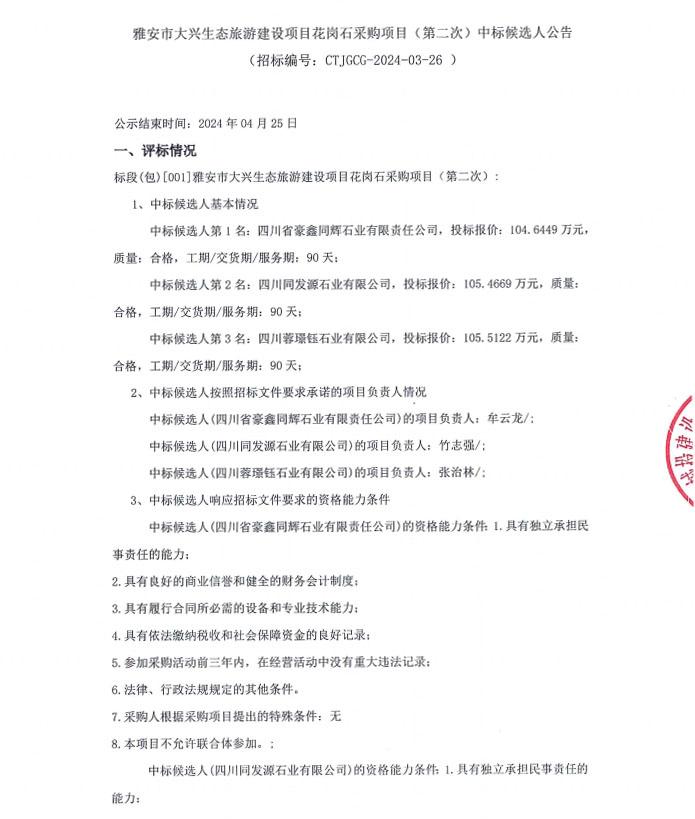 雅安市大興生態(tài)旅游建設(shè)項(xiàng)目花崗石采購(gòu)項(xiàng)目(第二次)中標(biāo)候選人公告