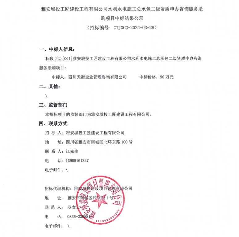雅安城投工匠建設(shè)工程有限公司水利水電施工總承包二級資質(zhì)申辦咨詢服務(wù)采購項目中標結(jié)果公示