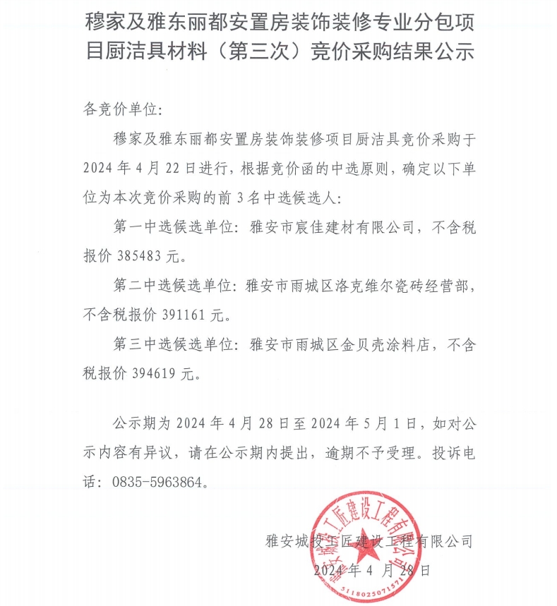 穆家及雅東麗都安置房裝飾裝修專業(yè)分包項(xiàng)目潔具材料(第三次)競(jìng)價(jià)采購(gòu)結(jié)果公示