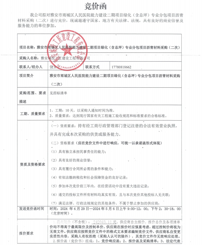 競(jìng)價(jià)函-雅安市雨城區(qū)人民醫(yī)院能力建設(shè)二期項(xiàng)目綠化(含總坪)專業(yè)分包項(xiàng)目瀝青材料采購(gòu)(二次)