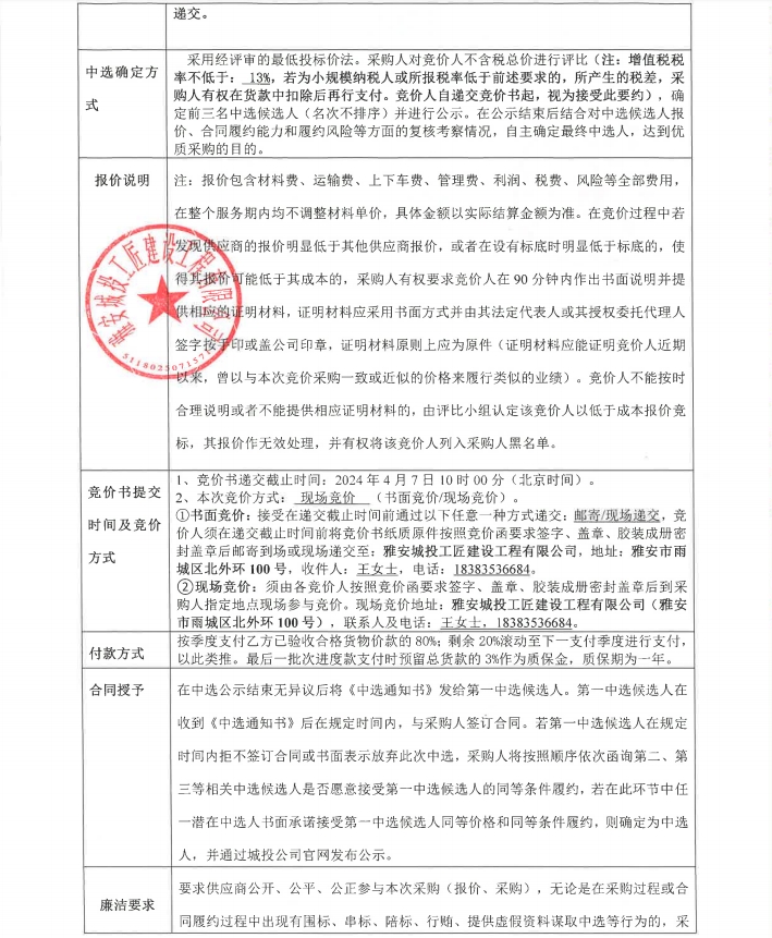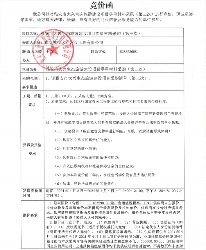 雅安市大興生態(tài)旅游建設(shè)項(xiàng)目零星材料采購(第三次)競價公告