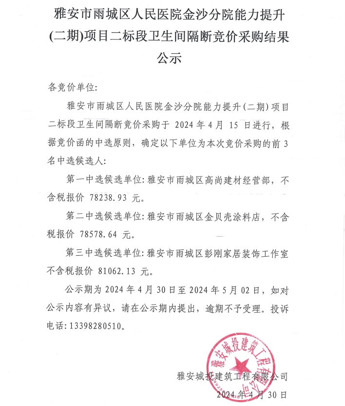 雅安市雨城區(qū)人民醫(yī)院金沙分院能力提升(二期)項目二標(biāo)段衛(wèi)生間隔斷競價采購結(jié)果公示
