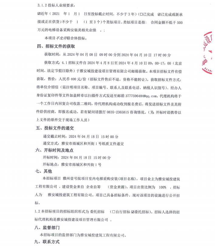 雅州壹號(hào)院項(xiàng)目室內(nèi)電梯采購(gòu)安裝(項(xiàng)目名稱)設(shè)備采購(gòu)/標(biāo)段公告