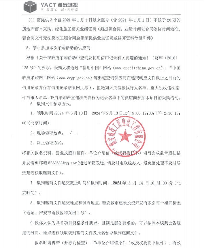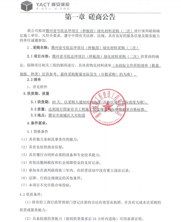 雅州壹號(hào)院總坪項(xiàng)目(樣板段)綠化材料采購 (二次)磋商公告