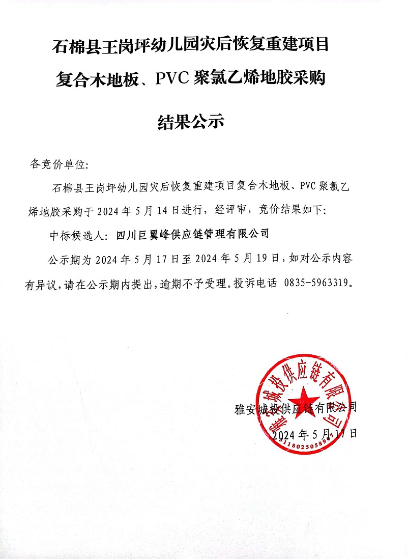 石棉縣王崗坪幼兒園災(zāi)后恢復(fù)重建項(xiàng)目復(fù)合木地板、PVC聚氯乙烯地膠采購(gòu)結(jié)果公示