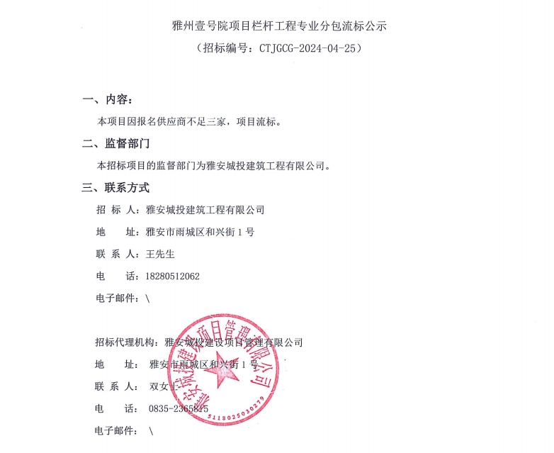 雅州壹號(hào)院項(xiàng)目欄桿工程專業(yè)分包流標(biāo)公示