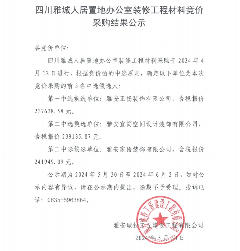 四川雅城人居置地辦公室裝修工程材料競價(jià)采購結(jié)果公示
