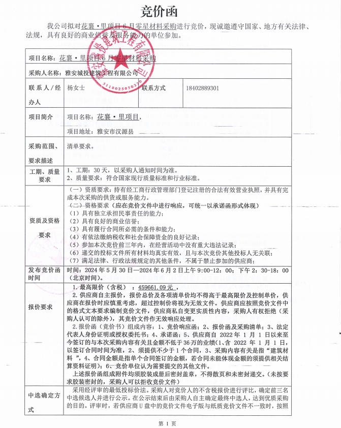 花襄·里項(xiàng)目6月零星材料采購(gòu)競(jìng)價(jià)公告