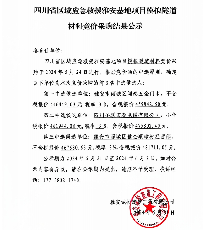 四川省區(qū)域應急救援雅安基地項目模擬隧道材料競價采購結果公示