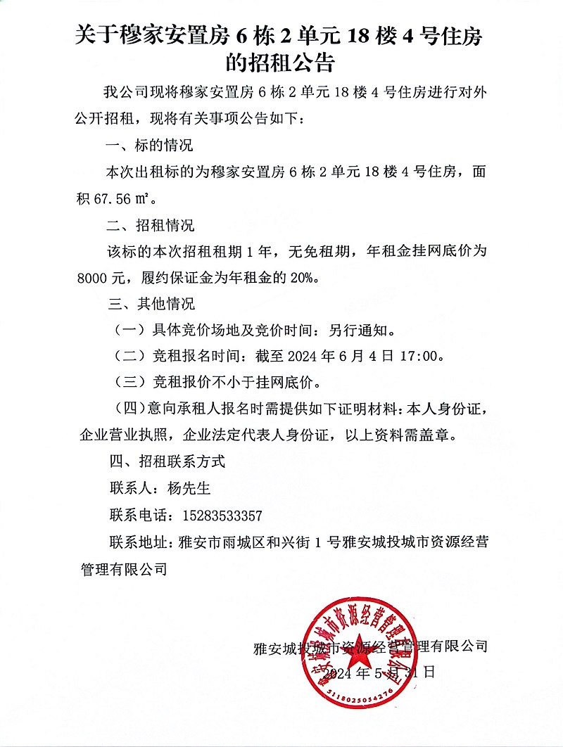 關(guān)于穆家安置房6棟2單元5樓4號住房的招租公告