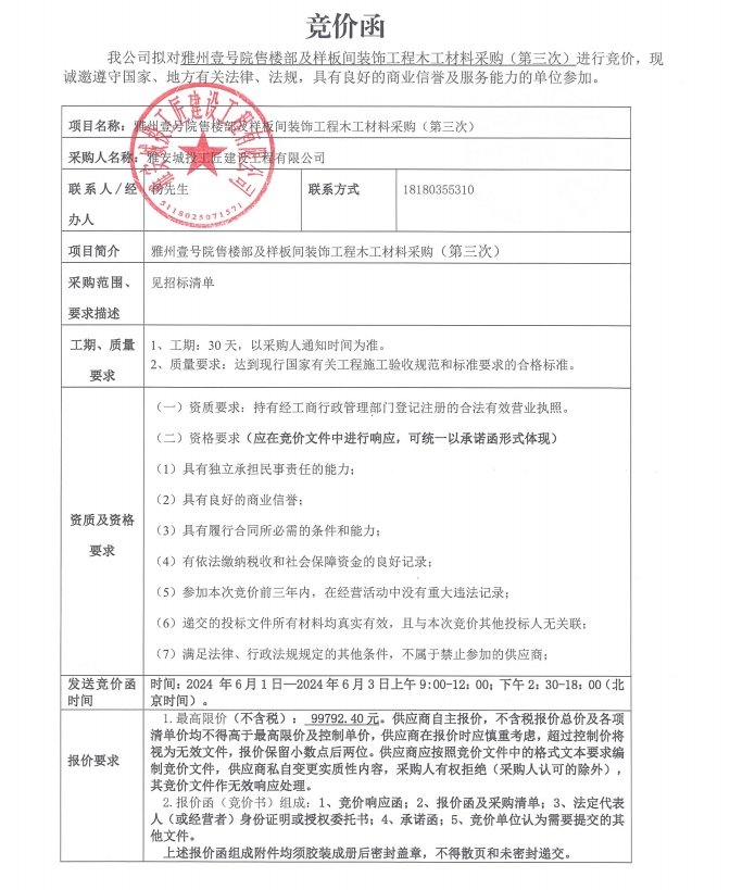 競(jìng)價(jià)函-木工材料采購-雅州壹號(hào)院售樓部及樣板間(第三次)