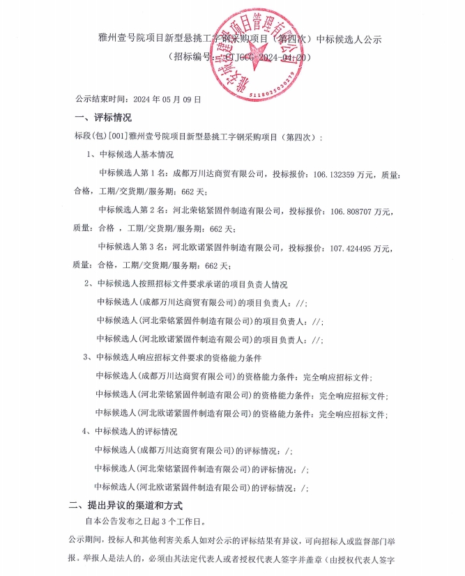 雅州壹號院項(xiàng)目新型懸挑工字鋼采購項(xiàng)目(第四次)中標(biāo)候選人公示