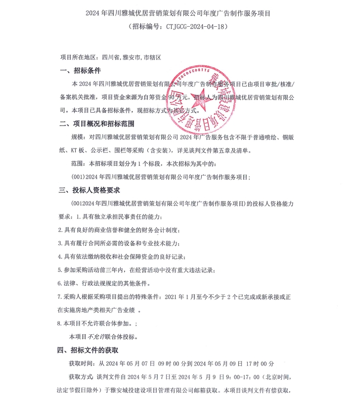 2024年四川雅城優(yōu)居營銷策劃有限公司年度廣告制作服務項目公告