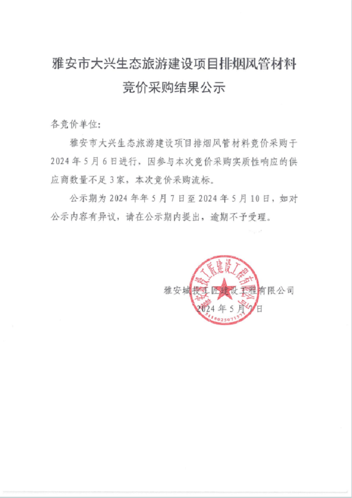 雅安市大興生態(tài)旅游建設(shè)項(xiàng)目排煙風(fēng)管材料競價(jià)采購結(jié)果公示
