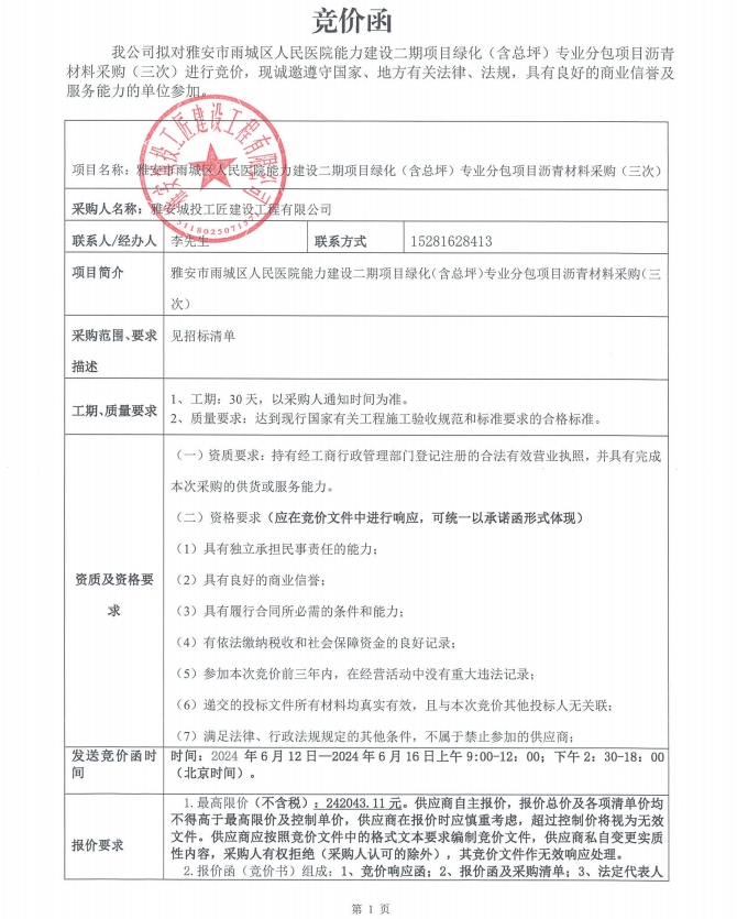 雅安市雨城區(qū)人民醫(yī)院能力建設(shè)二期項(xiàng)目綠化(含總坪)專業(yè)分包項(xiàng)目瀝青材料采購(gòu)(三次)競(jìng)價(jià)公告