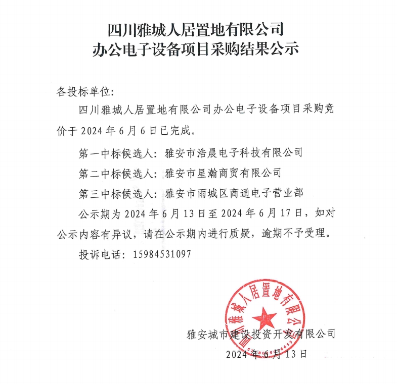 四川雅城人居置地有限公司辦公電子設(shè)備項目采購結(jié)果公示