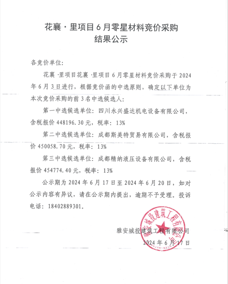 花襄·里項(xiàng)目6月零星材料競價采購結(jié)果公示