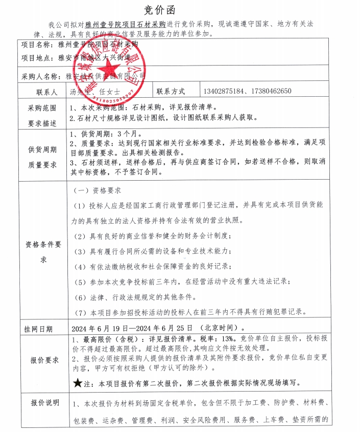雅州壹號院項(xiàng)目石材采購競價(jià)公告