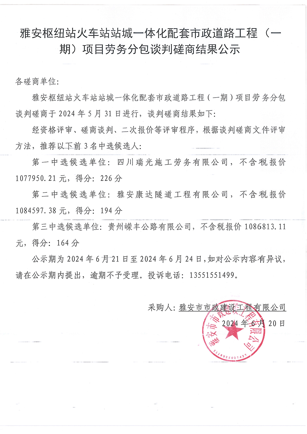 雅安樞紐站火車站站臺(tái)一體化配套市政道路工程(一期)項(xiàng)目勞務(wù)分包談判磋商結(jié)果公示