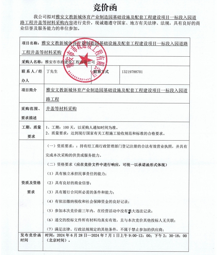 雅安文教新城體育產(chǎn)業(yè)制造園基礎設施及配套工程建設項目一標段入園道路工程項目井蓋等材料采購競價公告
