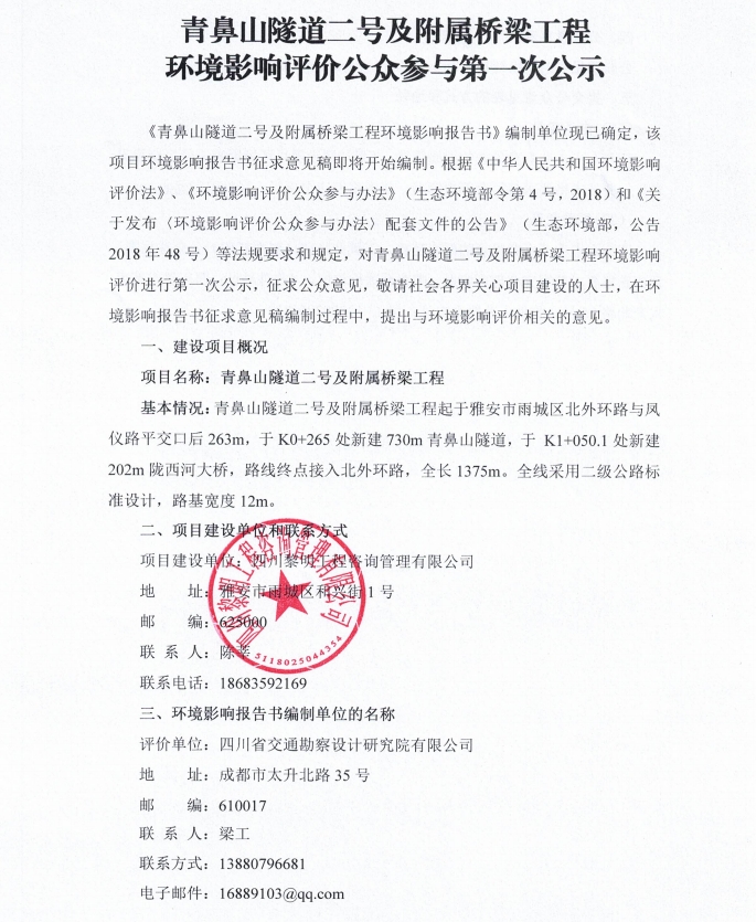 青鼻山隧道二號及附屬橋梁工程項目環(huán)境影響評價公眾參與第一次公示