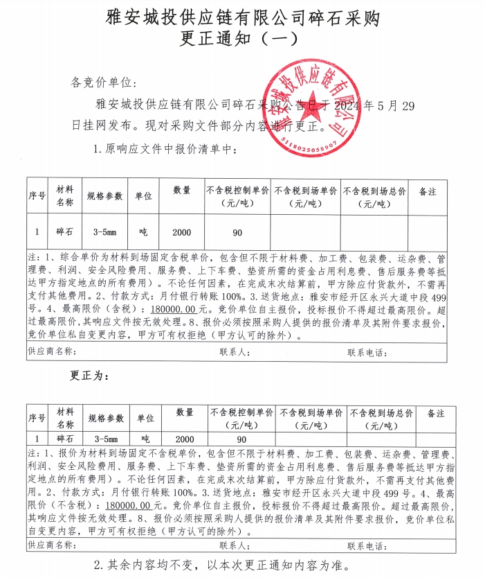 雅安城投供應(yīng)鏈有限公司碎石采購更正通知(一)