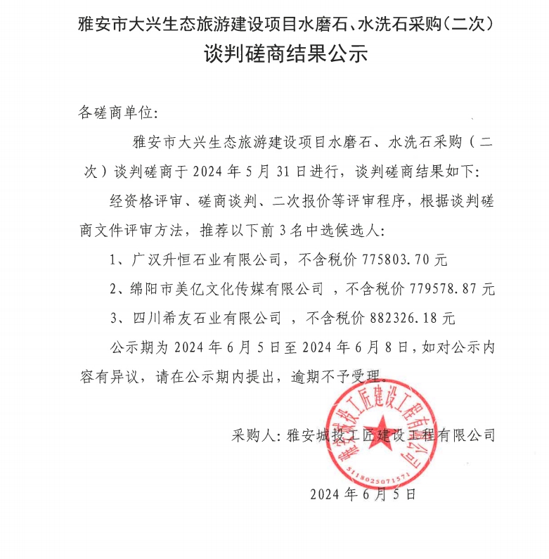 雅安市大興生態(tài)旅游建設(shè)項目水磨石、水洗石采購(二次)談判磋商結(jié)果公示