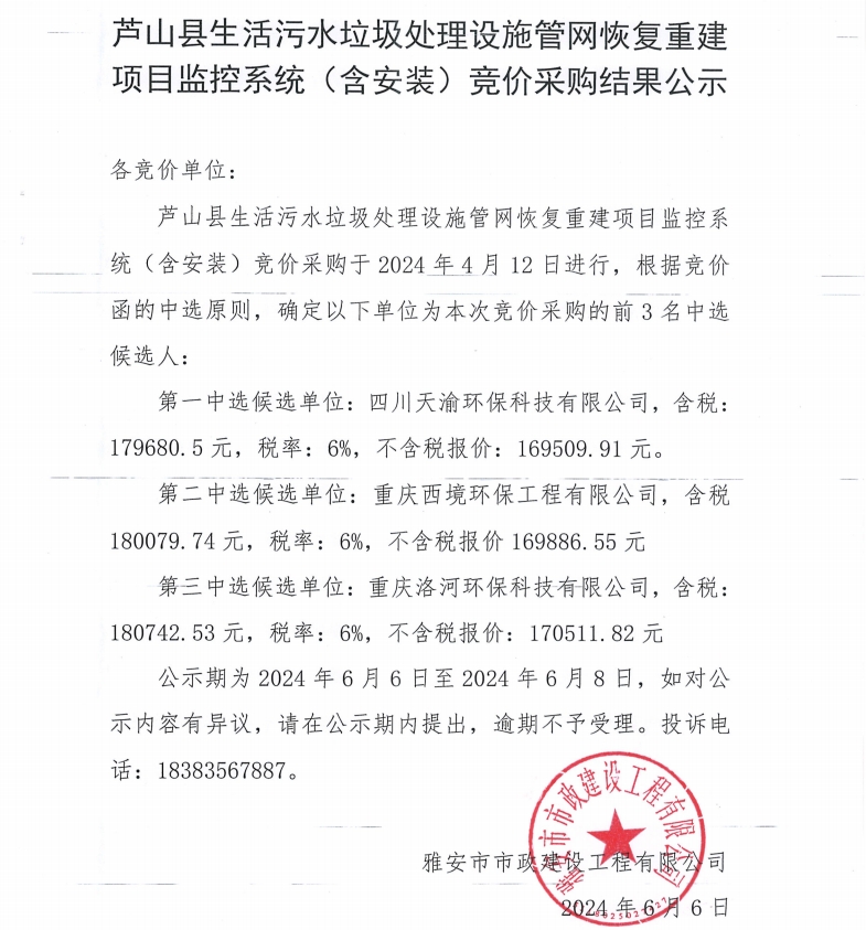 蘆山縣生活污水垃圾處理設施管網(wǎng)恢復重建項目監(jiān)控系統(tǒng)(含安裝)競價采購結果公示
