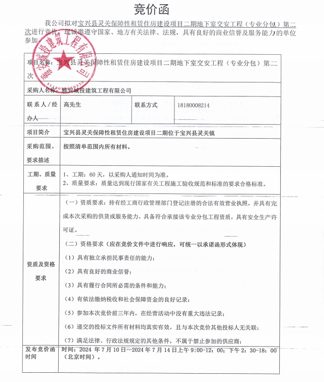 寶興縣靈關(guān)保障性租賃住房建設(shè)項(xiàng)目二期地下室交安工程(專(zhuān)業(yè)分包)第二次競(jìng)價(jià)公告