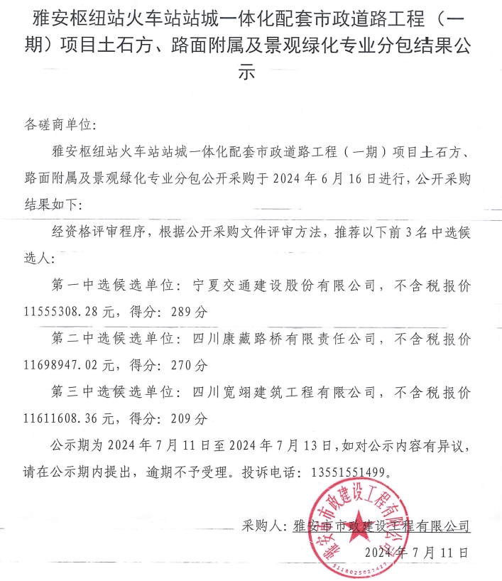 雅安樞紐站火車站站城一體化配套市政道路工程(一期)項(xiàng)目土石方、路面附屬及景觀綠化專業(yè)分包結(jié)果公示