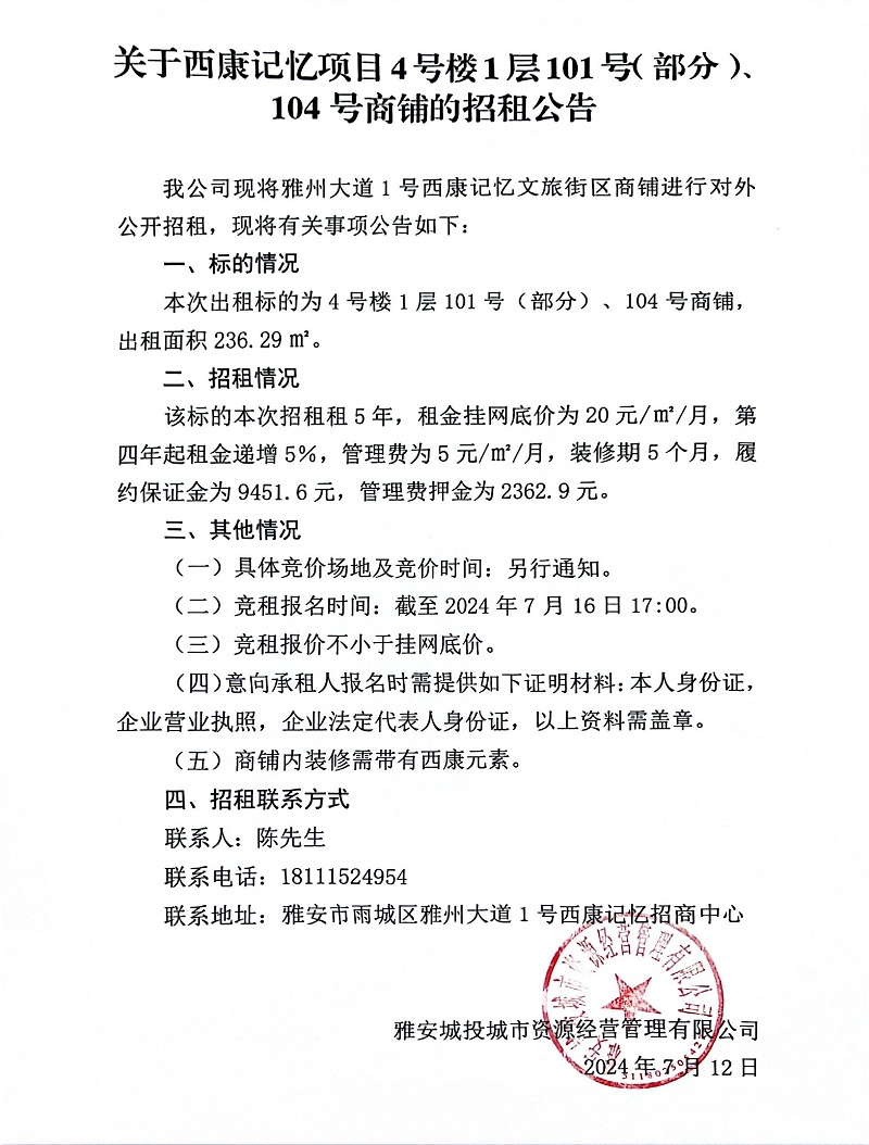 關(guān)于西康記憶項(xiàng)目4號(hào)樓1層101號(hào)(部分)、104號(hào)商鋪的招租公告