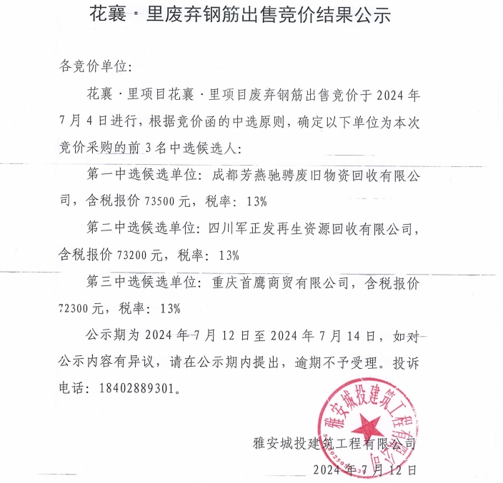 花襄·里廢棄鋼筋出售競價(jià)結(jié)果公示