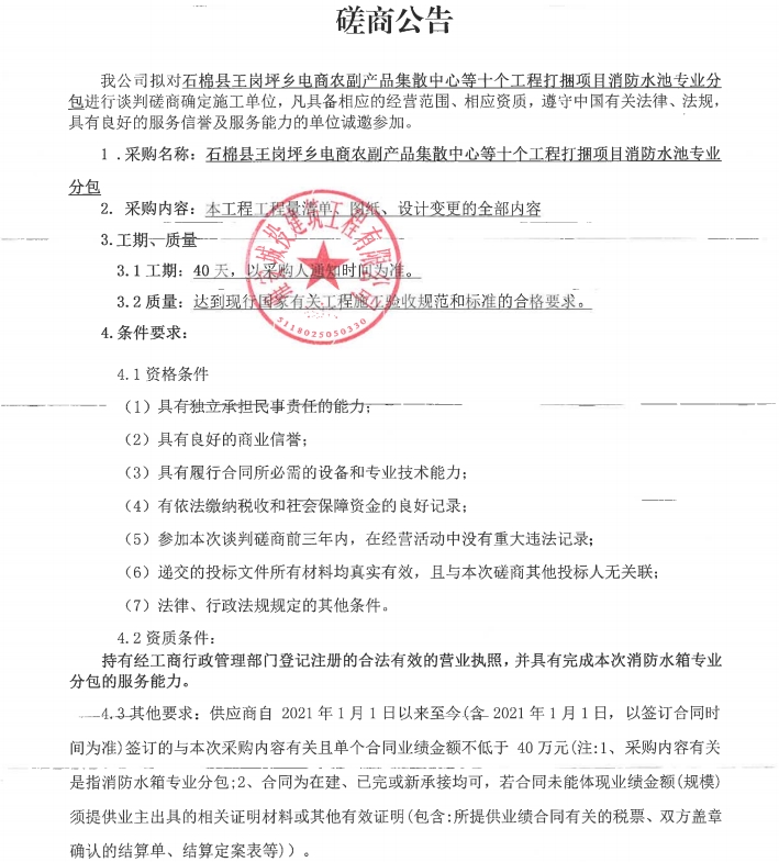 石棉縣王崗坪鄉(xiāng)電商農副產品集散中心等十個工程打捆項目消防水池專業(yè)分包談判磋商公告