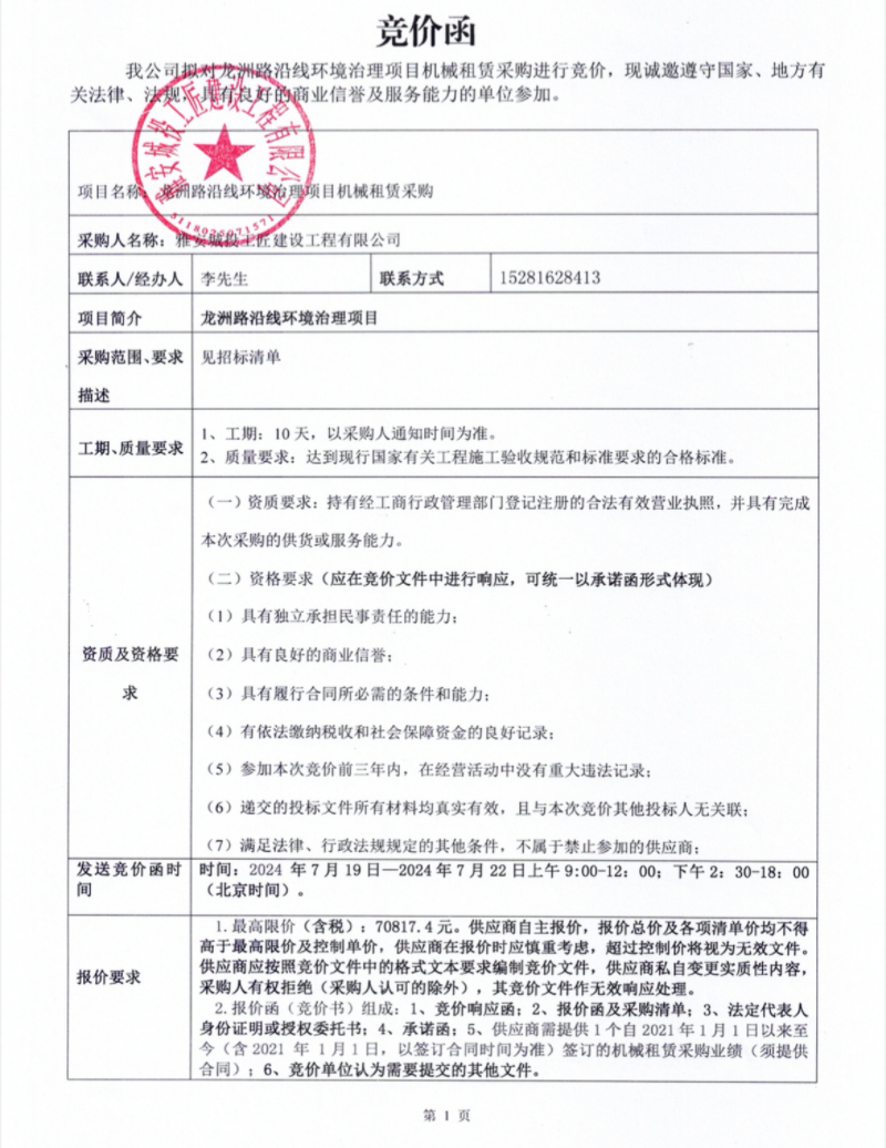 龍洲路沿線環(huán)境治理項目機(jī)械租賃采購競價公告