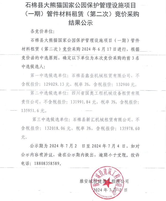 石棉縣大熊貓國(guó)家公園保護(hù)管理設(shè)施項(xiàng)目(一期)管件材料租賃(第二次)競(jìng)價(jià)采購(gòu)結(jié)果公示