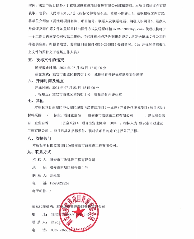 雅安市城區(qū)中心城市內(nèi)澇整治項(xiàng)目(一標(biāo)段)勞務(wù)分包服務(wù)項(xiàng)目(項(xiàng)目名稱)材料采購(gòu)招標(biāo)公告