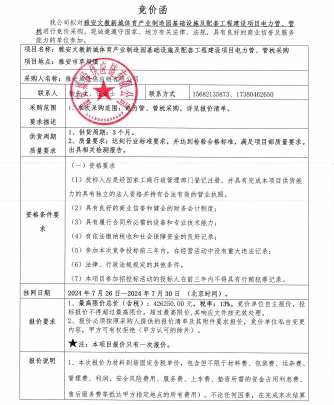 雅安文教新城體育產業(yè)制造園基礎設施及配套工程建設項目電力管、管枕采購競價公告