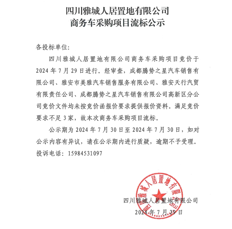 四川雅城人居置地有限公司商務(wù)車采購項目流標(biāo)公示