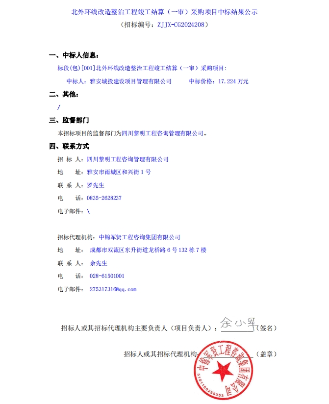 北外環(huán)線改造整治工程竣工結(jié)算(一審)采購項(xiàng)目中標(biāo)結(jié)果公示