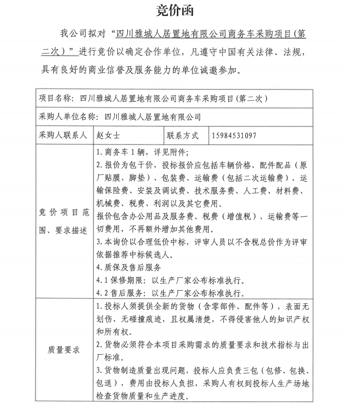 四川雅城人居置地有限公司商務(wù)車(chē)采購(gòu)項(xiàng)目(第二次)競(jìng)價(jià)公告